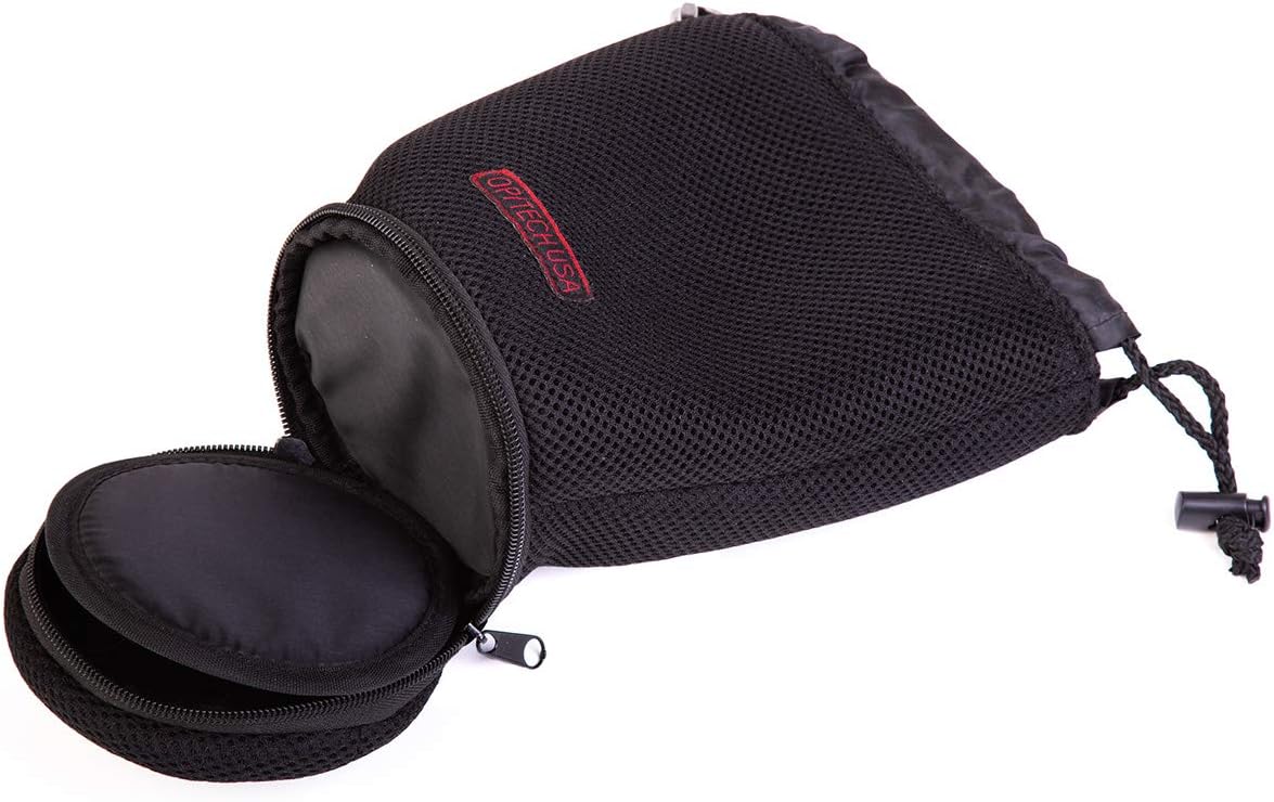 The lens/Filter pouch provides an easy-access carrying system for your lens and two filters. It offers two protective sections to better organize your gear; A zippered filter section with a padded protective divider holds two filters While the wide-mouth lens section offers ease of use and accommodates larger lenses with sunshades. It offers a drawstring closure, padded dust flap, snap attachment and belt loop.