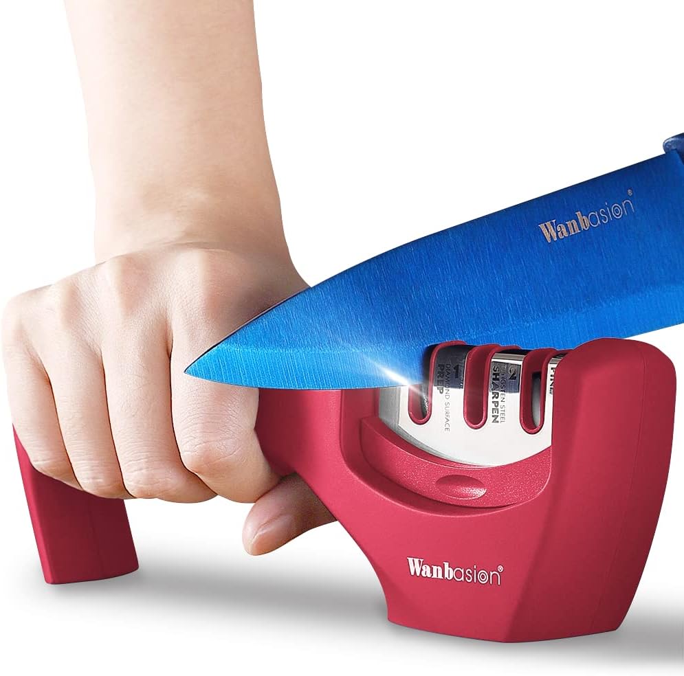 Exсluѕіvе Dіѕсоunt 90% Prісе Wanbasion Red Kitchen Knife Sharpener Professional 3 Stages, Kitchen Knife Sharpener Manual Sharpening, Knife Sharpener for Kitchen Knives with Stainless Steel Ceramic Diamond Blade Simple review